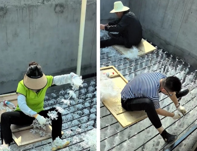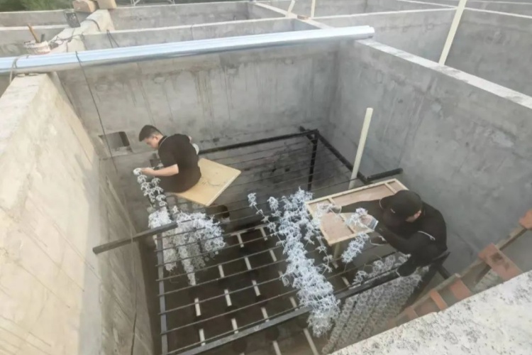 在鋼架焊接工作收尾后,緊接著的填料綁扎成了搶工期的關(guān)鍵。這些密密麻麻的填料是污水處理的“主力軍”,需要手工逐一固定在鋼架上,工作量大且要求細致。公司當即決定:全公司總動員,所有人前往施工現(xiàn)場,進入池內(nèi)協(xié)助綁填料。